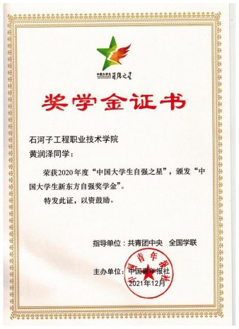 2021年荣获2020年度“中国大学生自强之星”荣誉称号